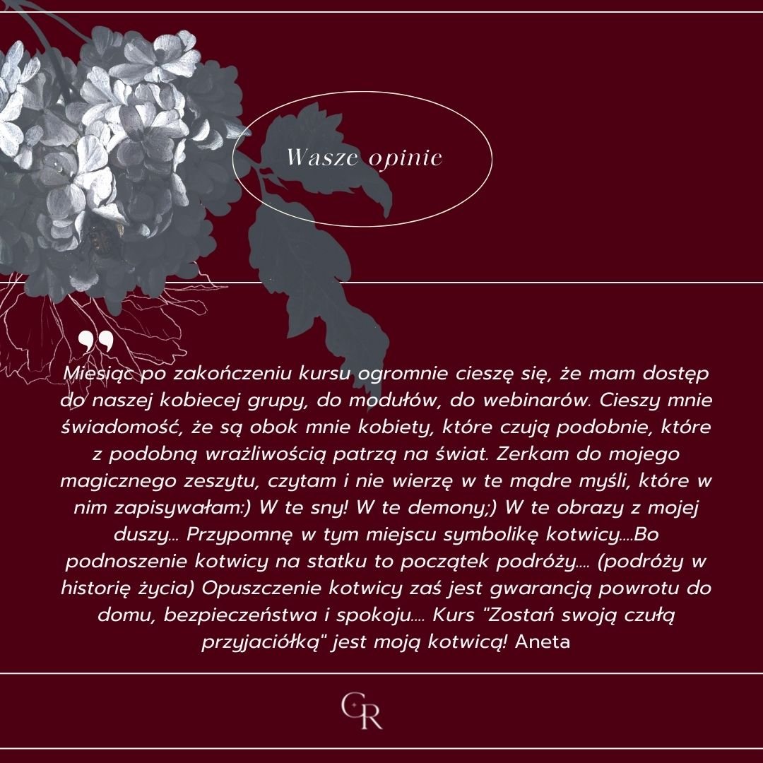 "Kurs u Darii pozwolił mi zaopiekować się sobą na wielu płaszczyznach: umysł dostał zrozumienie i metody do zastosowania od teraz, ciało połączyło się z emocjami, serce zostało otulone wsparciem grupy, ale co najważniejsze mnie samej, a dusza w swoim tempie wzrasta w głąb wzwyż i wszerz. Z wdzięcznością."